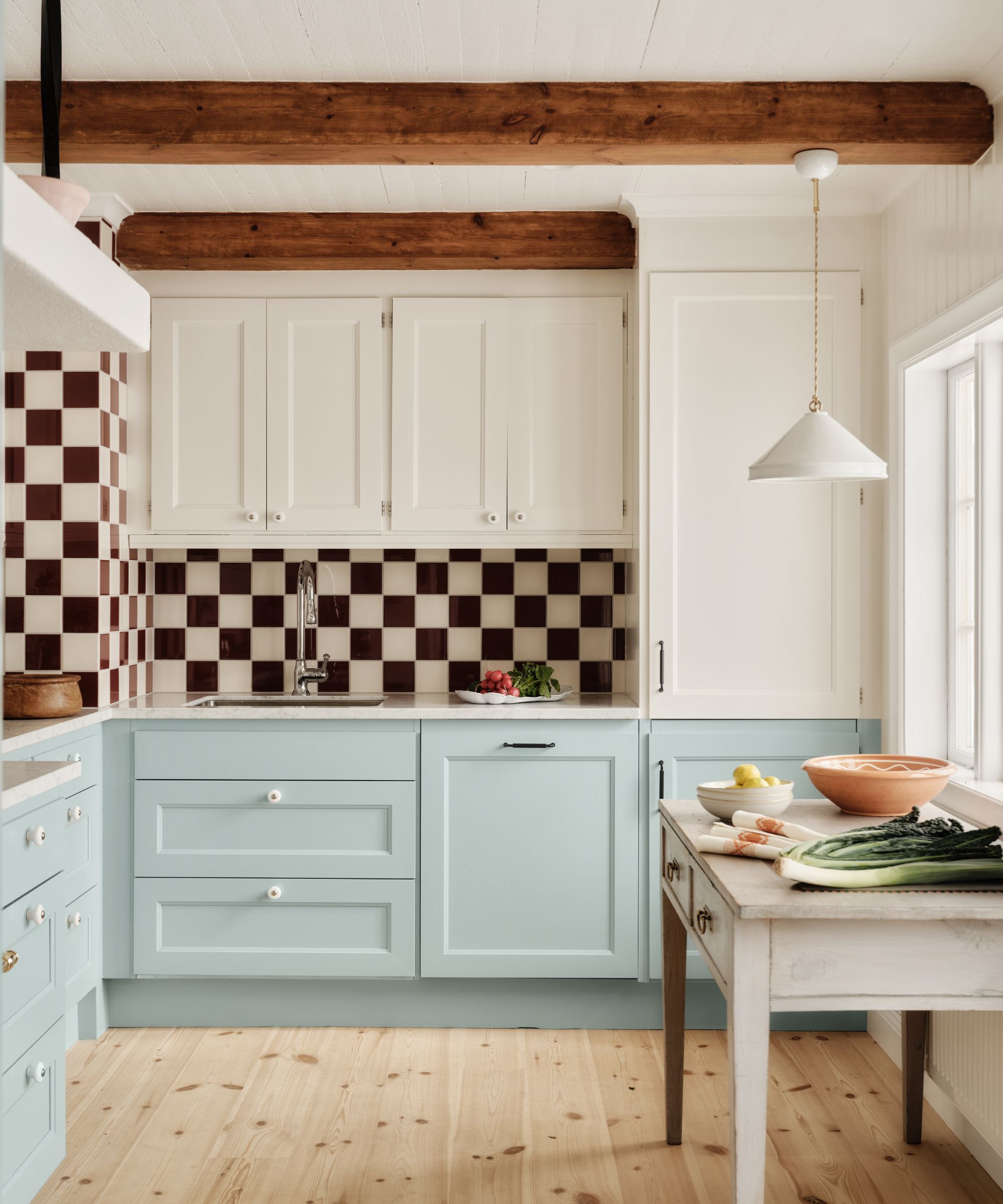 Two-tone kitchen cabinets were introduced in this Swedish summer house kitchen 'to make the small kitchen more interesting and more dynamic,' while staggered countertops offered a practical solution to the compact footprint. 'We wanted to earn more space after the deeper stove, and we didn't need that extra countertop space,' says Sanna Nathanson of Studio Ramson.