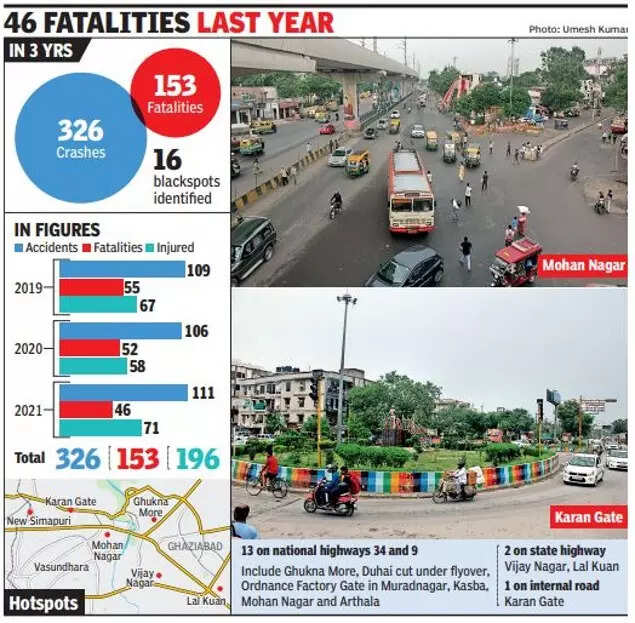According to the survey, there are two blackspots on NH-9: Vijay Nagar and Lal Kuan. Eleven others were identified on NH-34 -- Ghukna More, Duhai cut (under flyover), ITS cut, Ordnance Factory gate in Muradnagar, Hanuman Mandir cut in Muradnagar, Ganga river-Ravli road tiraha, Sethali cut, Kasba, Muradnagar Bamba road, Jalalpur cut, Mohan Nagar and Arthala.