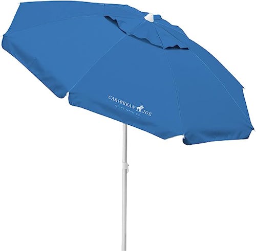 It weighs just a few pounds and comes with a bag for portability, but this Caribbean Joe beach umbrella has plenty of built-in features for protection and convenience. For one, its 6.5-foot canopy is made from UV-protective polyester. For another, it tilts to offer you the most shade without repositioning and comes with a sand screw anchor for stability at the beach. Finally, its eight-rib steel frame and vented canopy can handle the wind and can shield you from rain, too.