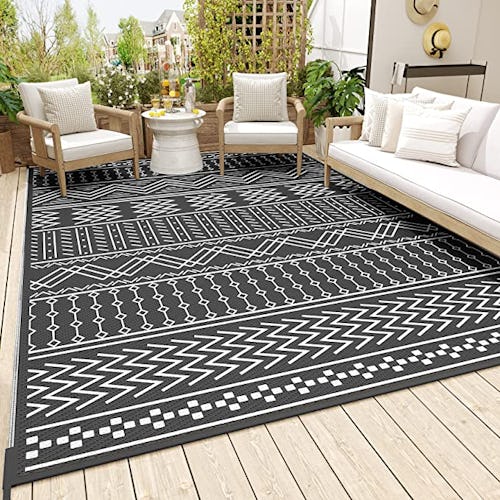 Because it’s woven from waterproof, stain-resistant recycled plastic, this outdoor area rug can handle dirt, rain, and UV rays. As a result, you can use it to warm up any space, including porches, decks, patios, balconies, and outdoor dining areas. If it gets dirty, spray it off with the hose and the material will rinse clean and dry fast. Since it’s lightweight and foldable, it’s also easy to store when the season’s over.