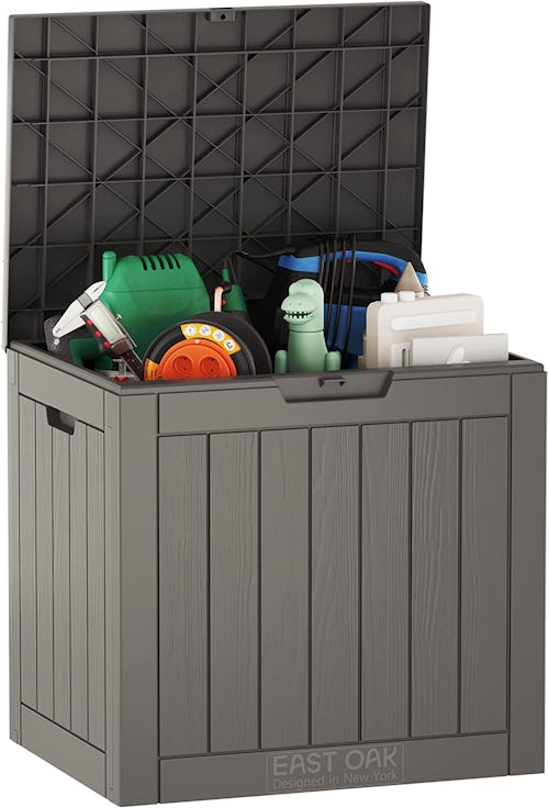 This outdoor storage box is made from durable, waterproof, UV-resistant resin, so it keeps your stuff dry (like pool toys, cushions, and gardening essentials) and can support up to 170 pounds when used as a seat. It also has built-in handles and comes with a padlock for security. Best of all, its faux wood panel exterior looks great on your deck or patio.