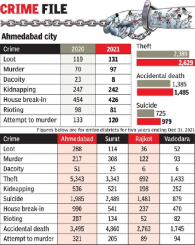 AHMEDABAD: The city of Ahmedabad reported increases in cases of loot (10%), murder (38.57%), theft (10.5%) and suicide (35%) in 2021, compared to 2020.