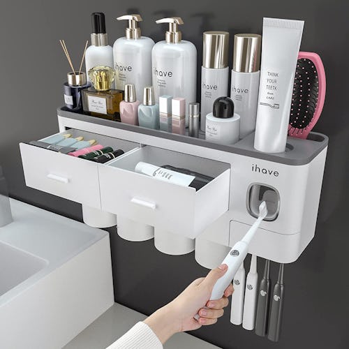Get your toothbrush, toothpaste, and other bathroom essentials off the counter. This wall-mounted dispenser has room for it all. Specifically, it has spots to hang seven toothbrushes, plus there are various trays, compartments, and drawers for everything else. Utilize the automatic toothpaste dispenser and magnetic mouthwash cups when needed.