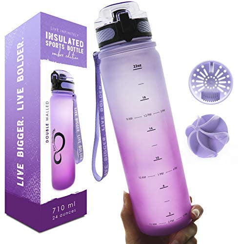 Live Infinitely 24 oz Water Bottle with Time Marker - Insulated Measured Water Tracker Screen - BPA Free Gym Water Bottle - Locking Flip Top Lid, Rubberized (Amethyst, 24oz)