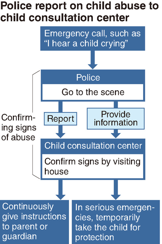 In April 2016, the NPA instructed all prefectural police headquarters to report any suspicious cases in which they quickly went to the scene and identified signs of abuse, such as bruises, to the centers. The agency also instructed the headquarters to provide information to the centers or municipal governments, even on cases in which they could not determine whether there was abuse.