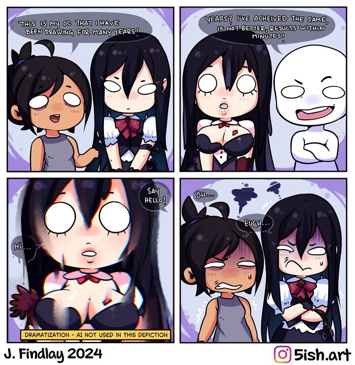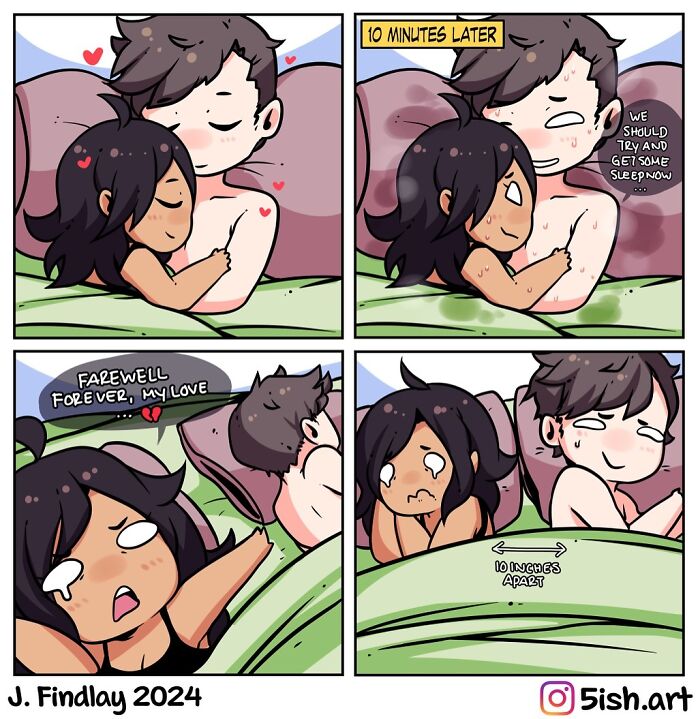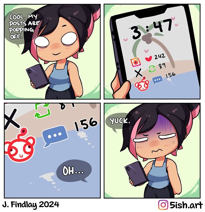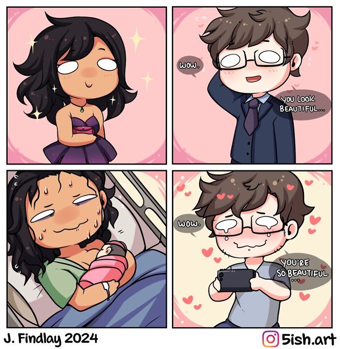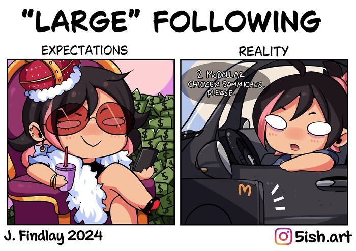 This illustrator, who goes by 5ish.art on Instagram, finds joy in drawing mostly female cartoon characters in a slightly spicy way. In addition to these illustrations, J. Findlay also creates lighthearted and funny comics. Most of the comics revolve around life as an artist, a mom, and a wife, topics to which a lot of people can relate.