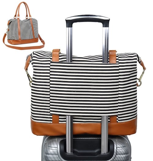 With a roomy interior, various pockets, and soft canvas exterior in 13 different designs, the CAMTOP purse is already an ideal carry-on or weekender bag. That said, this one has something that others don't — a brilliant strap that allows you to slip it onto the handle of your luggage, so you can roll through the airport with all your belongings in tow. Some designs are even made with zippered shoe compartments on the bottom.
