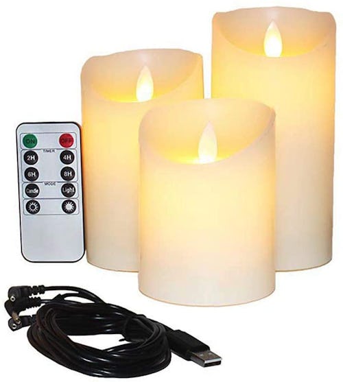 These three LED flameless candles are remote-controlled and can be set to run over four different time periods (two hours, four hours, six hours, and eight hours). The candles' shells are made from paraffin wax that really resembles a genuine candle, but involves zero flames. Instead these candles run on rechargeable batteries that can charge in one to two hours using the included USB cords.
