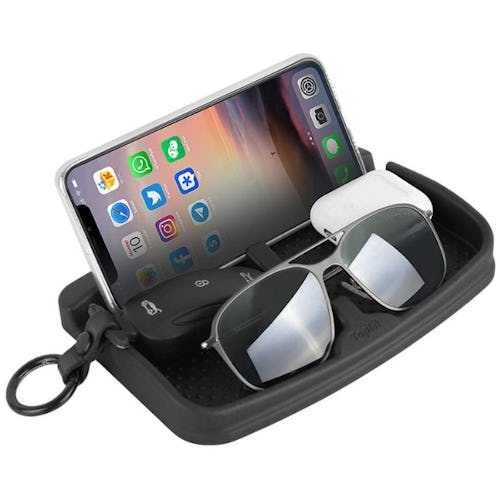 If your car's a little light on storage, you might need this dash grip pad. An adhesive backing sticks directly on your dash, creating a seamless built-in look. Use the mount for phones and tablets up to 7 inches in size. This mount features a center divider to help keep your sunglasses in place.