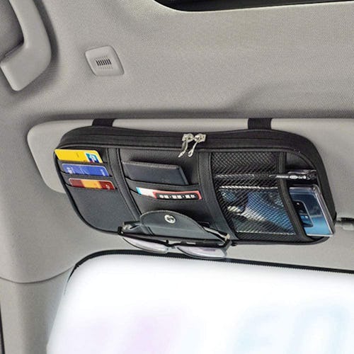 Working on the road is a little bit easier with this convenient sun visor organizer. Multiple compartments make it easy to organize your stuff and keep it within reach. A zippered compartment is great for documents and paperwork, and the mesh pocket holds other essentials. This organizer even has a clip for your sunglasses and slots for credit cards.