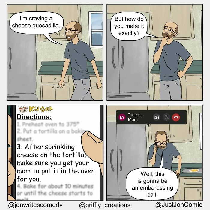 Just Jon is an artist who specializes in clean, minimalist comics that capture the small but painfully familiar moments of social discomfort, awkward honesty, and everyday absurdity. His work often shows people fumbling through blunt conversations, misreading cues, or delivering brutally honest confessions in a deadpan style.
