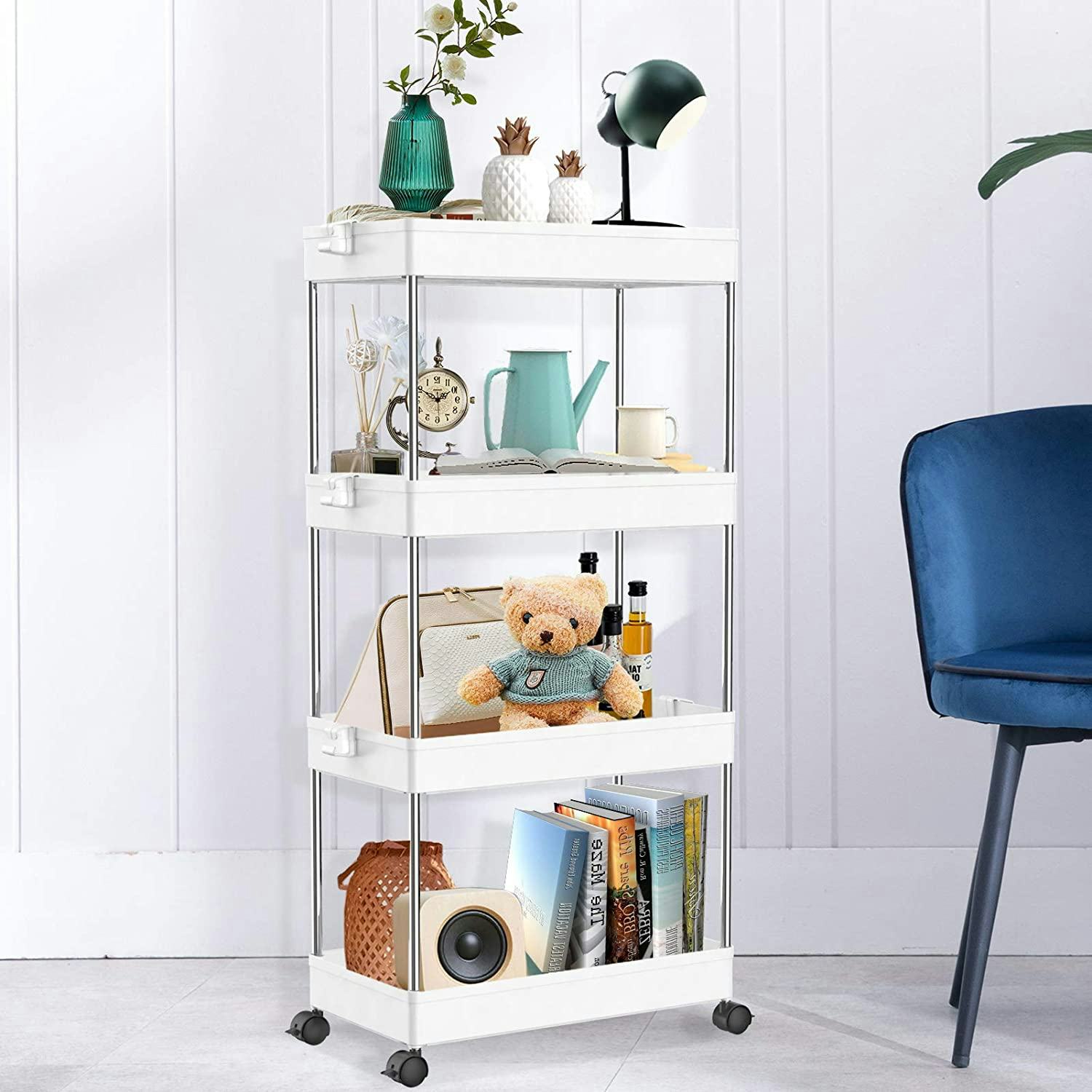 With convenient rollers on the bottom, you can easily move this tiered cart out of storage and around your home. Since it's slim, it won't take up too much room in the closet. And thanks to the multiple shelves, you can store a bunch of things.