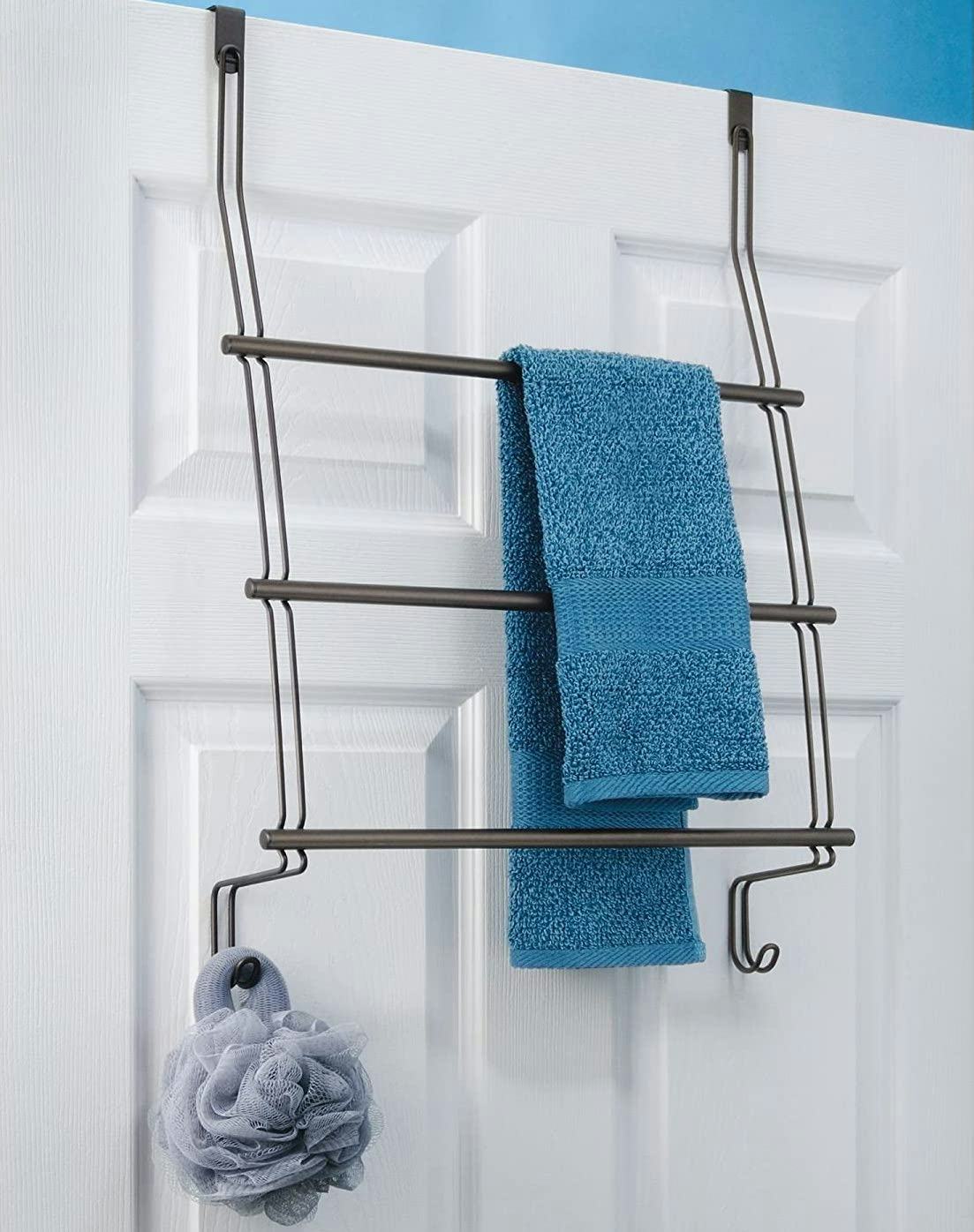 Add this this sleek steel rack to your bathroom door or closet and enjoy the extra storage. Hang towels over the three towel bars, or hang robes and loofahs on the two additional hooks.
