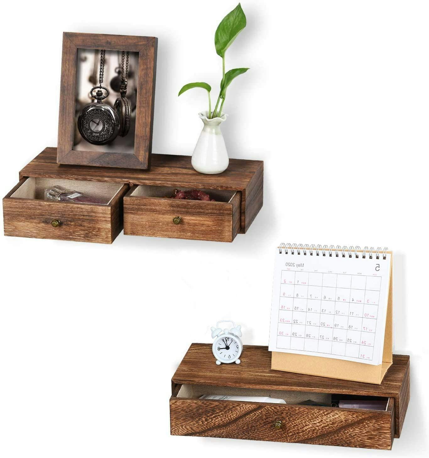 Whether you want to save space by using these small floating shelves as nightstands, wall shelves, or even desktop organizers, they're sure to come in handy. Made from wood with your choice of three different finishes, you get two shelves per package. One shelf has one drawer, and the other has two. They come with all the hardware you'll need to mount them on the wall, and each can hold up to 22 pounds.