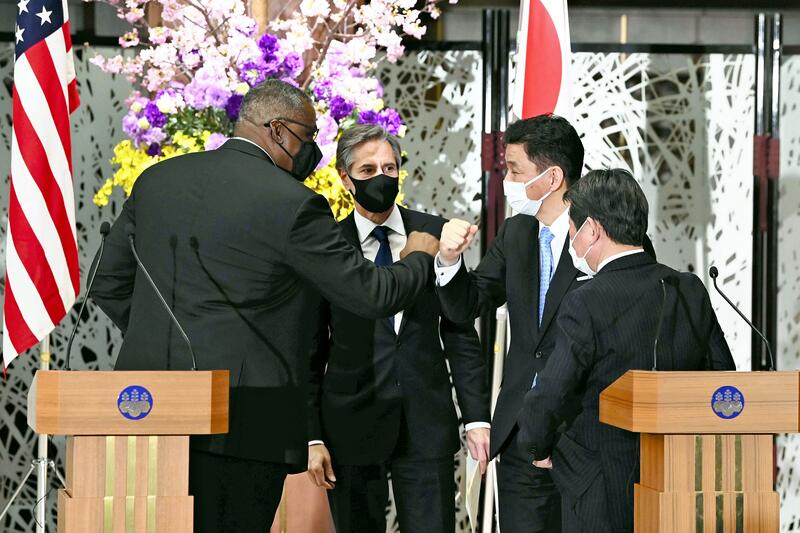 From left, U.S. Secretary of Defense Lloyd Austin, U.S. Secretary of State Antony Blinken, Defense Minister Nobuo Kishi and Foreign Minister Toshimitsu Motegi are seen after a joint press conference in Minato Ward, Tokyo, on Tuesday. (Credit: The Yomiuri Shimbun)