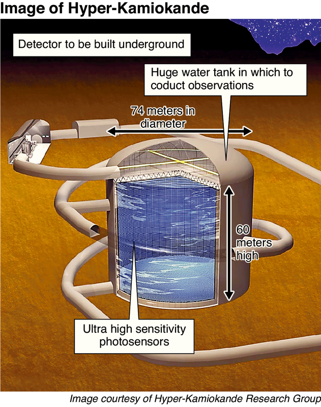 It would have a huge water tank 60 meters high and 74 meters in diameter, equipped with numerous ultra high sensitivity photo sensors designed to capture the faint light emitted when neutrinos, a type of elementary particle, collide with the water in the tank, and other events.