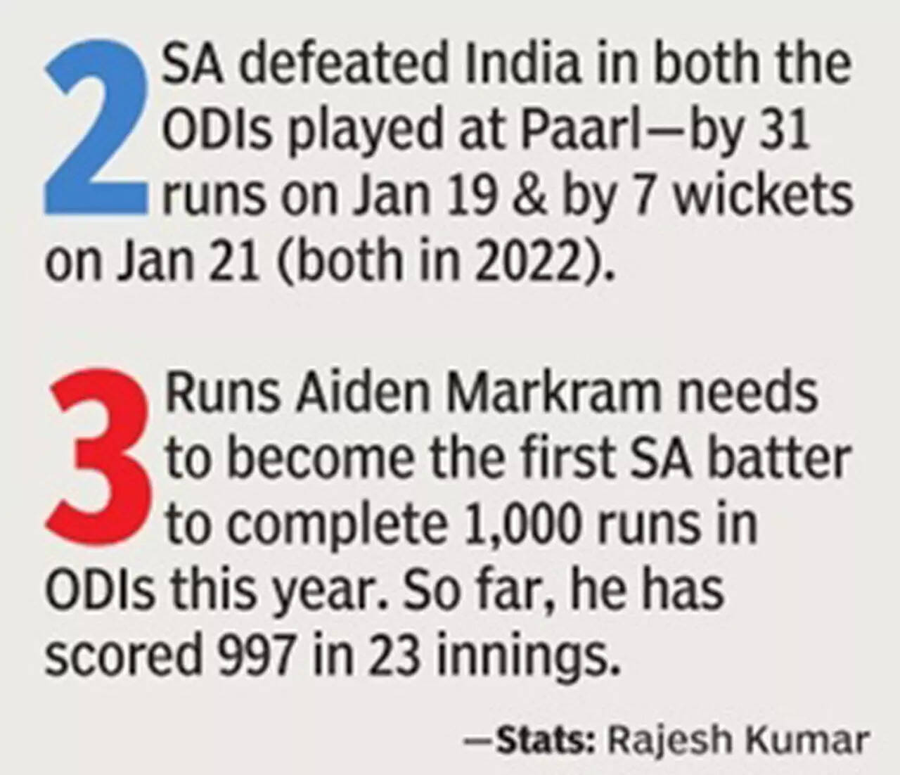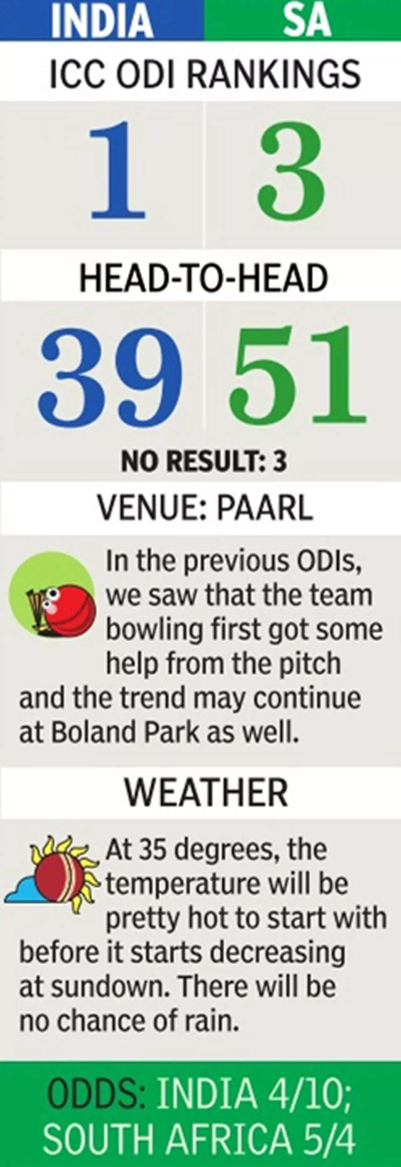 NEW DELHI: India's hopes of winning their second ODI series in South Africa will depend on a strong start from the openers in the third and final match in Paarl on Thursday. The first two matches followed a similar plot of a faltering opening combination.