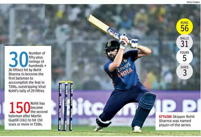 KOLKATA: India skipper Rohit Sharma threw a challenge to his spinners on winning the toss for the third time in the just-concluded T20I series against New Zealand at the Eden Gardens here on Sunday. He decided to bat. It was like daring Axar Patel and Yuzvendra Chahal, who had replaced the in-form Ravichandran Ashwin, to show what they can do with a dew-coated ball.
