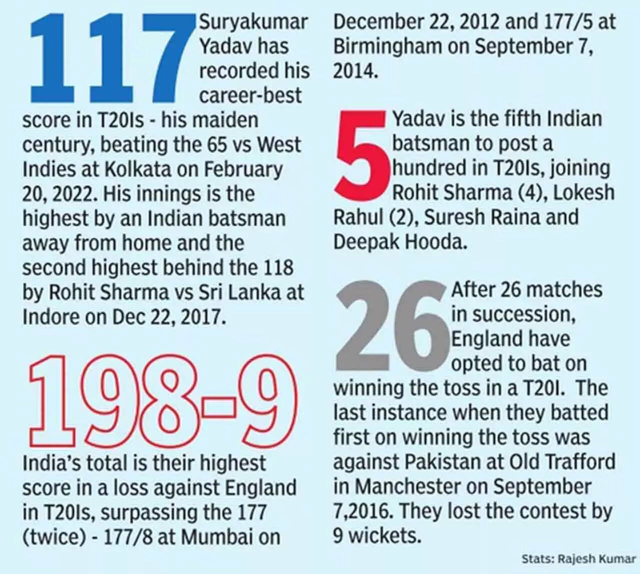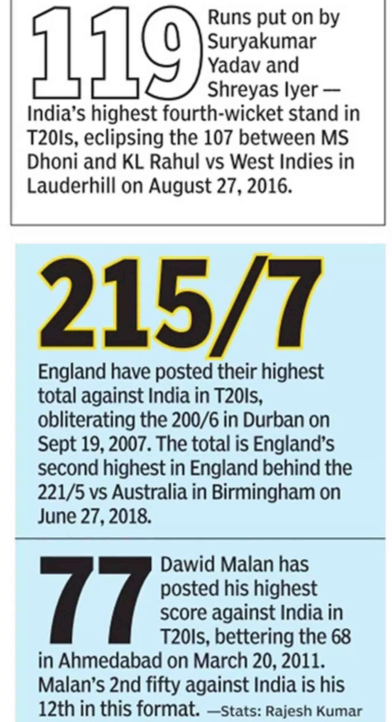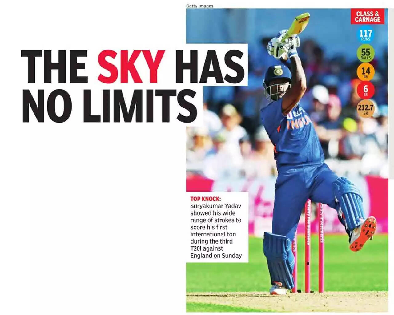 Though it ended up in a losing cause, Yadav's phenomenal century put to shade Dawid Malan's magnificent 77 (39b, 6x4, 5x6) and Liam Livingstone's quickfire 42 not out (29b, 4x6), which helped England score an imposing 215 for seven after the hosts chose to bat first.