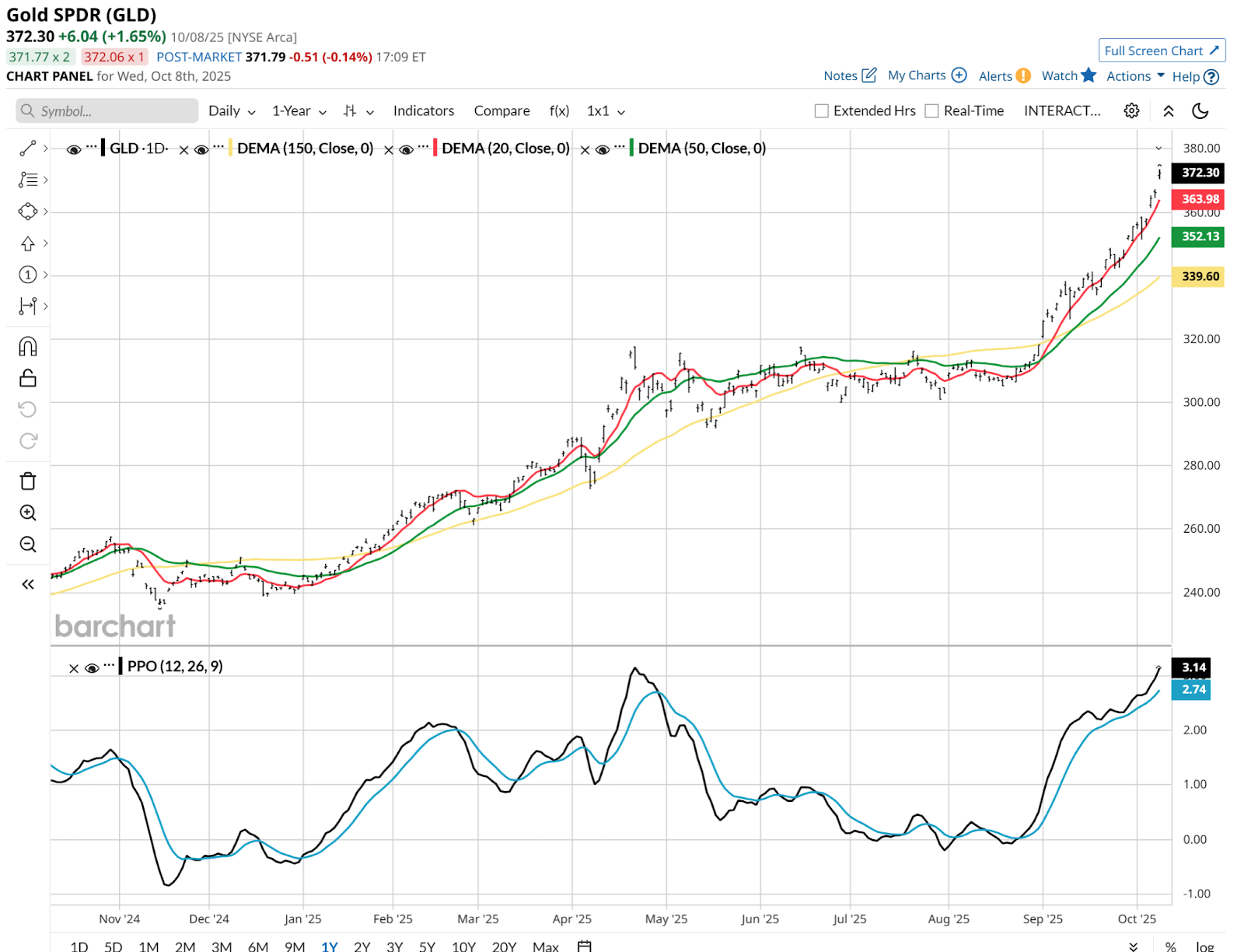 For investors in GLD, other ETFs that track the spot price of gold, and even funds that aim to benefit from appreciation in gold mining stocks, this is a critical time to think about where the gold rush can go. The chart above (daily view) shows the nearly parabolic move the yellow metal has delivered recently. It is up 20% since late August.