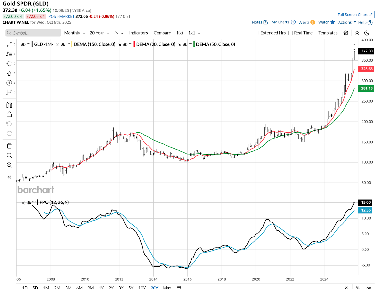 And here is GLD back to 2006. That Percentage Price Oscillator (PPO) indicator at the bottom recently reached all-time high territory. In other words, on that measure, it is more richly valued now than at any time in the past 20 years. The last time it ran up that high was in 2012. What happened next? A nearly 50% decline.