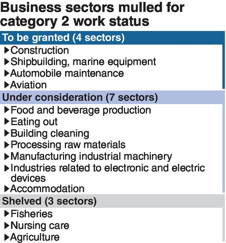 Concerning the category 2 status, which requires higher skills than category 1, the government has been considering not applying the status to all 14 industries. Instead it has been examining the possibility of narrowing down the number of eligible industries by taking into account requests from each industry and their business environments.