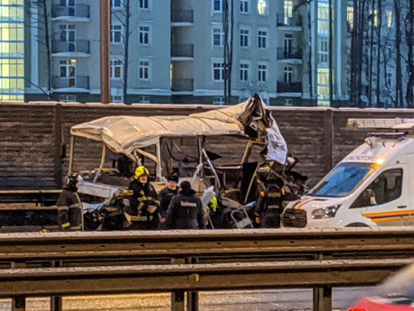 Russian news reports said that the convoy of buses had stopped after the leading vehicle had a malfunction, and the truck crashed into them from behind.