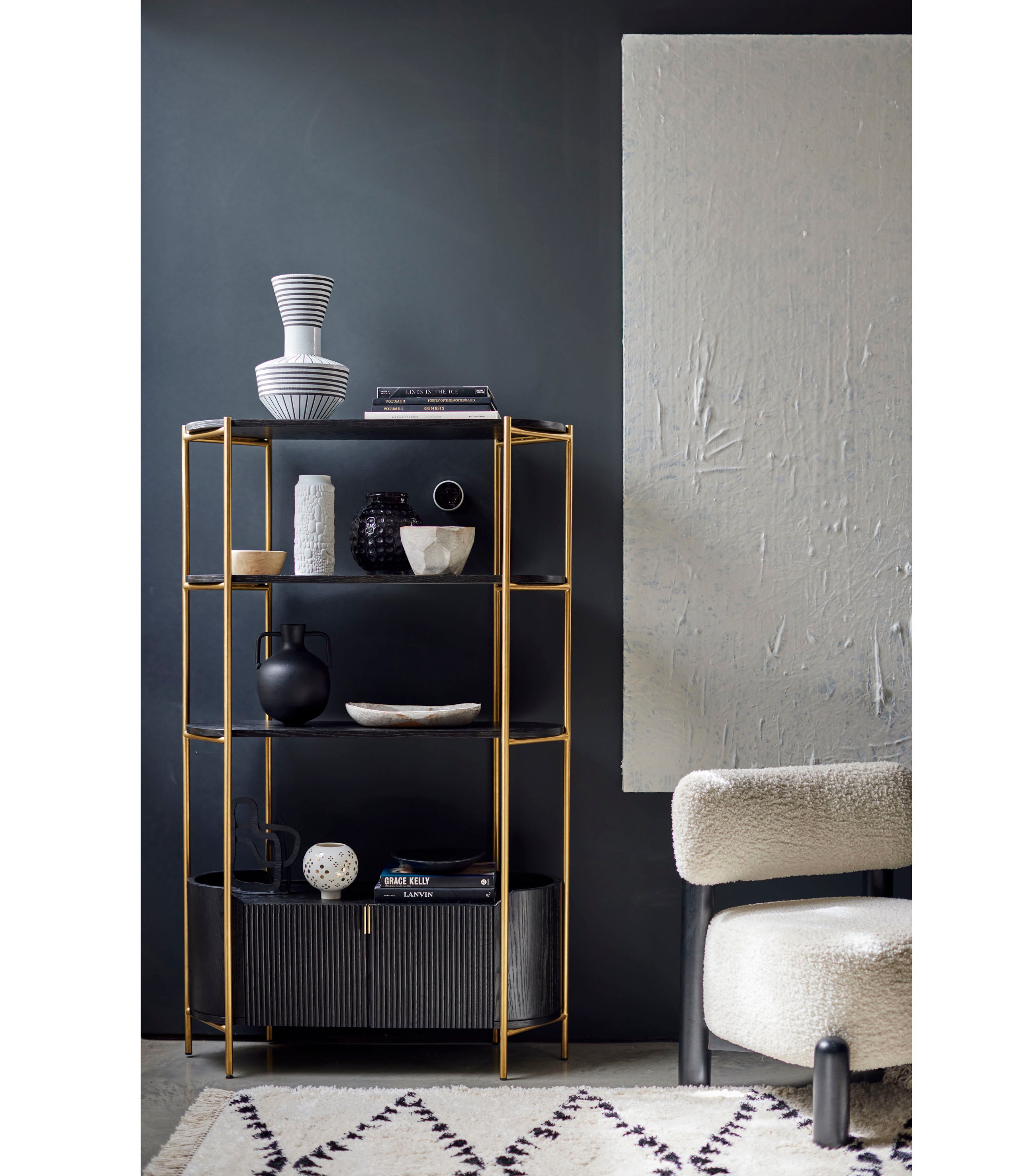 To style your shelves and place accessories just so, the designer says it’s good to have a mixture of taller things, think photos, books, and suggests including some flowers within the scheme.