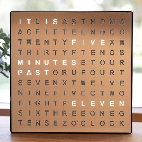 This LED clock swaps numbers for illuminated words, creating a sleek, conversation-starting alternative to traditional timepieces. It spells out time in five minute increments, and in phrases like “It is fifteen past eleven,” making it look like a piece of contemporary art. With its copper face and minimalist font, it’s a stylish, modern accent for any desk or nightstand.