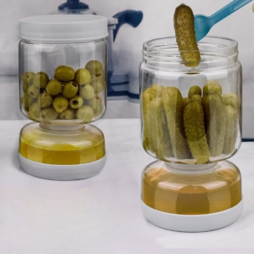 Why swish your fingers through brine when this clever pickle jar does the job for you? Its dual-compartment design separates liquids from solids — just flip it to drain the brine, then flip it back to let your pickles soak again. Made from thick, durable glass, it features an airtight, leakproof lid and a nonslip silicone base for stability. The flexible silicone strainer lifts easily for quick draining, and every part is dishwasher-safe for effortless cleanup.