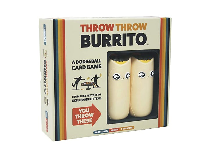 If you have fond memories of dodge ball and like the game Exploding Kittens, this card-dodge ball fusion game is for you. According to reviewers, it's hilarious and something you want to play in a space where you can't break anything, because you will be lobbing a soft burrito at each other.