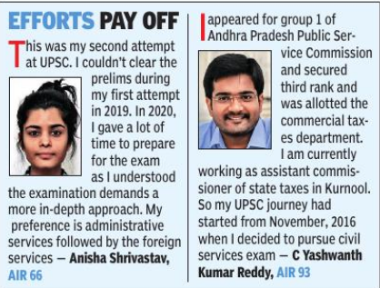 With an all India rank (AIR) of 20, P Srija emerged as the Telangana state topper followed by Rallapalli Jagat Sai (AIR 32), Aneesha Srivastava (66), Devagudi Mounica (AIR 75) and Challapalle Yashwanth Kumar Reddy (AIR 93). This year, many who cracked the examination are first-timers. “I completed my BTech in 2019 and decided to focus completely on the UPSC exams. I am happy that I cleared it in my very first attempt. My preference is the foreign services,” said Richa Kulkarni (AIR 132).