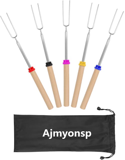These telescoping roasting sticks extend out 32 inches so you can toast your marshmallows, hot dogs, and more from a safe distance. When not in use, they collapse down to 12 inches. The wooden heat-resistant handles stay cool for safe handling, and cleaning them is as easy as soaking the prongs in a glass of water for about 15 minutes. Each set comes with five sticks in different colors so it's easy to keep track of yours, and they come with a convenient carrying case.