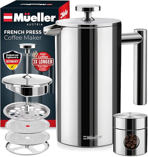 Give your coffee experience an upgrade with this handsome insulated French press that's less than $30. The triple-layered filter keeps sediment under control, and the insulation keeps coffee hot for more than an hour, while the handle stays cool to the touch. The generous 34-ounce capacity makes plenty of coffee for you and the crew, and each order even includes a bonus matching canister for grounds.