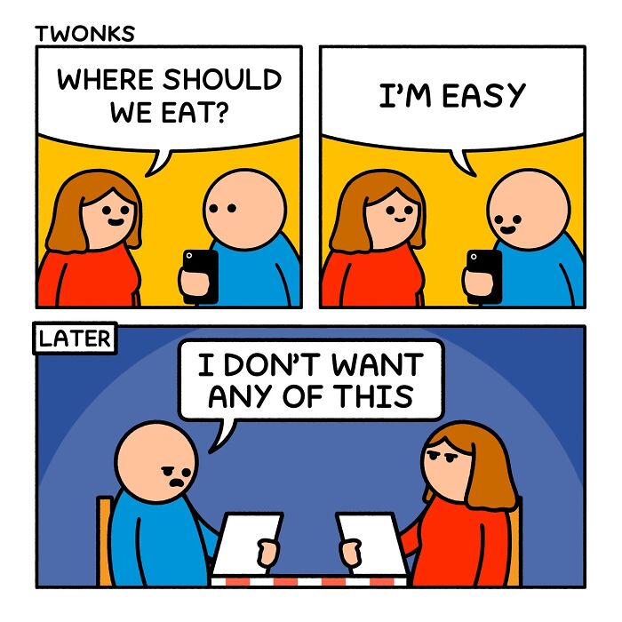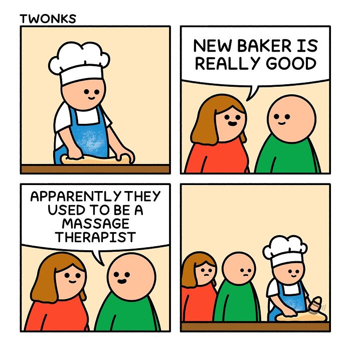 Steve Nelson, the creator of Twonks, has built a following with his minimalist comics that blend dry humor, British sarcasm, and sharp everyday observations. He often draws inspiration from his own routines, admitting that his popular Monday/Friday strip — showing the shift from healthy eating at the start of the week to pizza and snacks by Friday — “barely had to be exaggerated” because it reflects his real life and what so many can relate to.