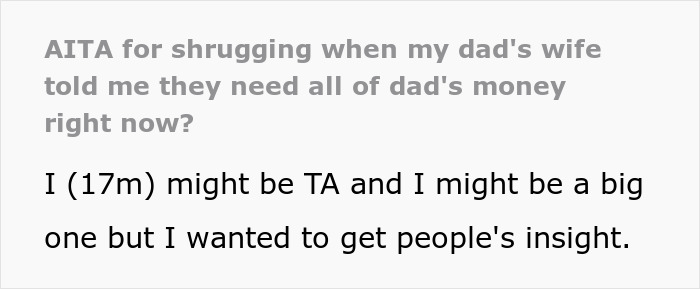 “[Am I The Jerk] For Shrugging When My Dad’s Wife Told Me They Need All Of Dad’s Money Right Now?” Bored Panda