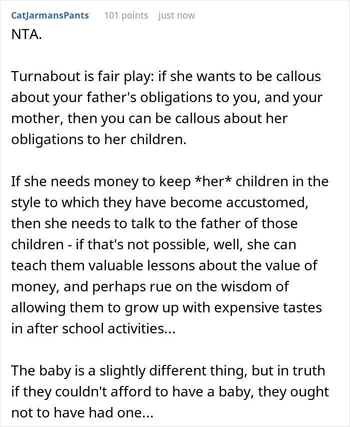 People also mentioned that it was none of her business that he was getting the money from his dad and if she had a problem with it, she should take it up with him rather than bothering the teen about it. They also pointed out that her kids were only missing two activities from tons of other ones they did, which was not a big deal and she was making a mountain out of a molehill.