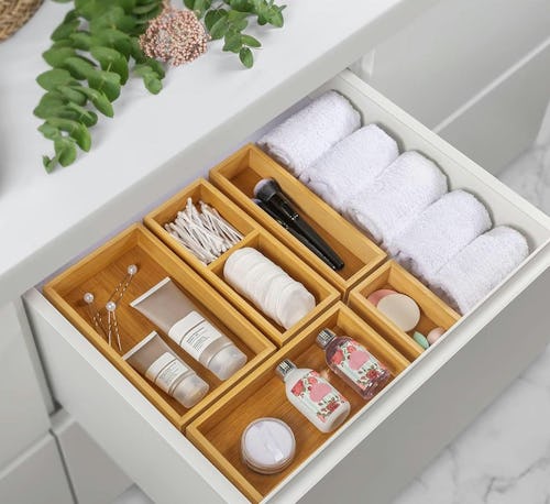 According to Tina O’Keeffe, Chief Organizing Officer with Stow and Behold Professional Organizers, “A lot of people forget about basic drawer dividers to wrangle multipurpose drawers.” This pack of five bamboo drawer organizers is so easy to deploy. Fit the different sizes together in the drawers and create spaces in a variety of sizes to stash everything from kitchen tools in the kitchen to cosmetics in the bathroom. “It makes a big difference to create sections,” she says.