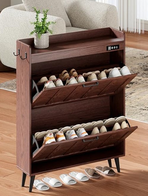 This slim shoe storage cabinet is exactly what Stow and Behold Professional Organizers’ Tina O’Keeffe had in mind when she recommended furniture with secret storage compartments. It is a slim piece that’s easy to sneak into any room. The top surface is a great place to set your EDC or phone. There are hooks for bags. And the front panels open up and store your entire shoe collection. But the best part? It aerates the interior on a schedule so your shoes smell good when you put them on. It comes in five colors.