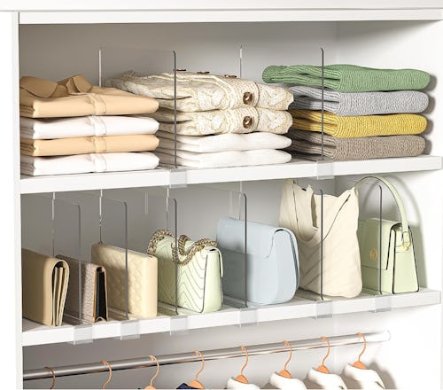 Amazon -If the shelves in your closet are solid, Jane Stoller of Organized Jane recommends these shelf dividers. “Acrylic shelf dividers ensure that you no longer have toppling piles of sweaters or jeans. These keep stacks tidy and easy to grab,” she says. They slide right onto the shelf and make it easy to stack clothing, stand purses up, and see what is in your closet. They are clear, so they don’t block light and come in a variety of multipacks.