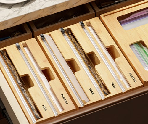 “Invest in a wrap organizer for foil, cling wrap, etc. to ensure no more boxes pop open or foil rolls get messed up, crinkled, and lost,” suggests Jane Stoller of Organized Jane. This bamboo version with three slots will bring instant order to that kitchen drawer. It comes with labels so you know what’s in each slot, and there are three options, so you can choose the configuration that suits what you have. It comes in four colors.