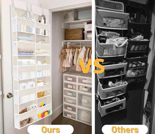 “Shelf dividers make life easier,” says Tina O’Keeffe with Stow and Behold Professional Organizers. “Often, people have wide open shelves in their closet, and when they start to fold and stack their clothes, the stacks start to sag. A shelf divider is an easy solution that just keeps your stacks in order. [They’re] also great for separating things like purses.” This version snaps into wire shelves for an easy containment solution and comes in a variety of multipacks. There are two styles. One has built-in hooks.