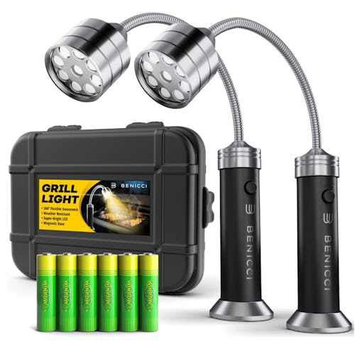 When you’re grilling in the dark, this two-pack of grill lights comes in handy. The lights have a strong magnetic bottom that grasps onto any grill, and they feature high-density LED bulbs. The lights are multipurpose and can also be used as flashlights. Six AAA batteries are included, so you can use them right away.
