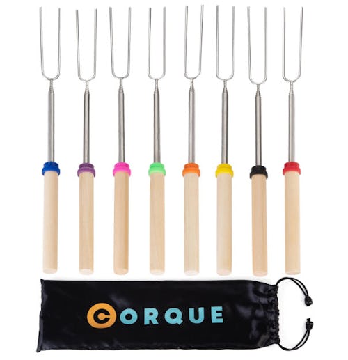 Each of the eight sticks in this pack of marshmallow roasting skewers has a wooden handle and can extend up to 32 inches to keep hands far enough away from a fire. They’re great for making s’mores, but also ideal for hot dogs and vegetables while camping or in the backyard. With each one having a different color assigned, it’ll also be easy to keep track of whose is whose.