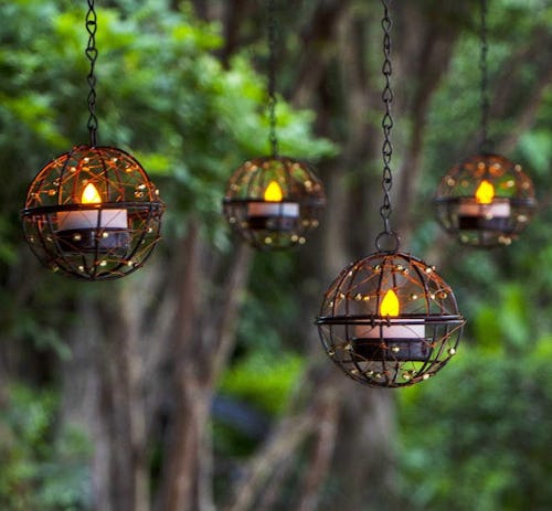 Add ambient lighting to your back patio with these stunning outdoor hanging lanterns. The set of four copper wire ball lanterns comes with four solar-powered tea lights that illuminate for 5 hours on a full charge. The lanterns are connected to 12-inch long hanging chains for easy hanging.