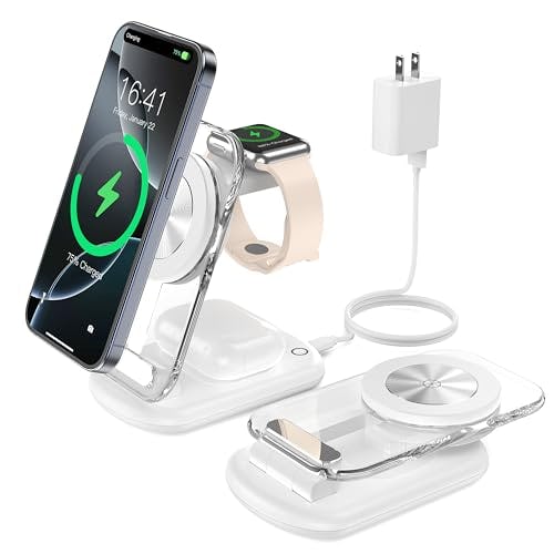 3 in 1 Magnetic Wireless Charging Station for Apple Devices, Fast Foldable Travel Mag-Safe Charger Stand with Night Light for iPhone 16 15 14 13 12 Series, Apple Watch/AirPods Pro