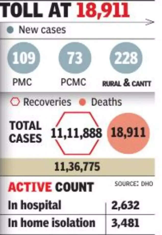 The PMC limits added 109 new patients. Around 483 patients were discharged in rural areas, cantonments and councils, while PMC and PCMC limits reported 167 and 165 recoveries, respectively. The tally of positive cases increased to 11,36,775 while recoveries reached 11,11,888.
