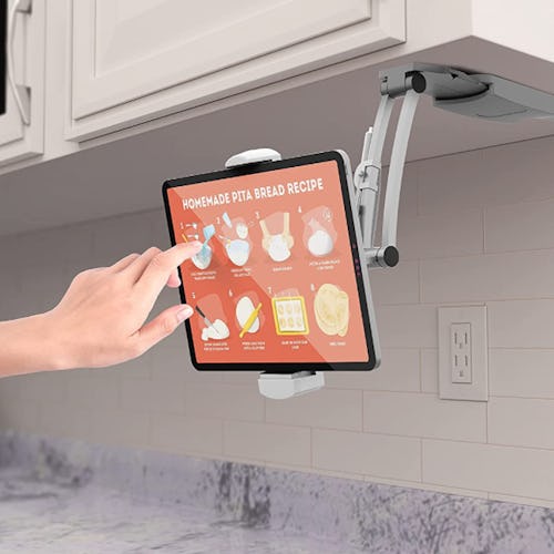 This tablet mount will hold your device so you can use it as a kitchen recipe book, whether you like cooking videos or written recipes. It can be mounted on the wall, under a cabinet, or placed on a tabletop. Plus, the holder can be rotated 360 degrees to give you the most comfortable viewing angle.