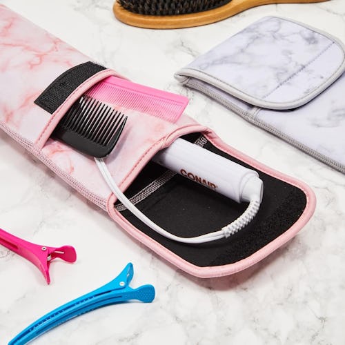 This hair tool holder is a great way to pack straighteners and curling irons, last minute, sans damage. It’s made from a heat-resistant neoprene material that acts as a barrier between their heated plates and your belongings. Use the discreet pocket at the front to store combs, pins, and other small accessories you need to keep close.