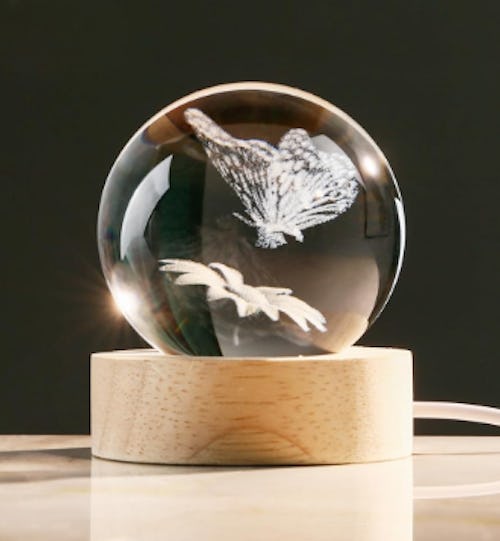 Instantly elevate your room decor with this crystal ball night-light. The glass sphere houses a detailed 3D image featuring everything from a butterfly and cat sitting in a flower pot, to a four leave clover and mermaid. Its multicolor light features are just an added bonus.